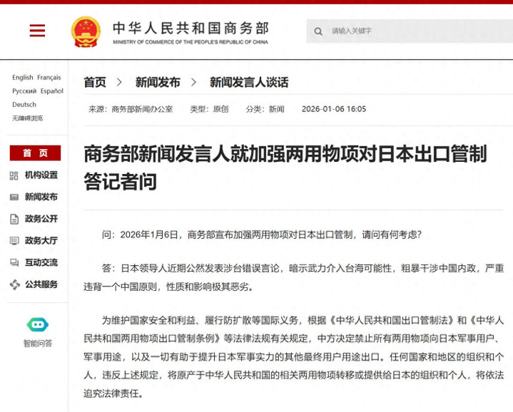 中方加强两用物项对日本出口管制,商务部:日方言论性质和影响极其恶劣-2026-01-06 16:38·观察者网